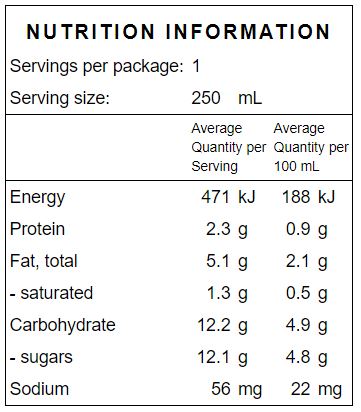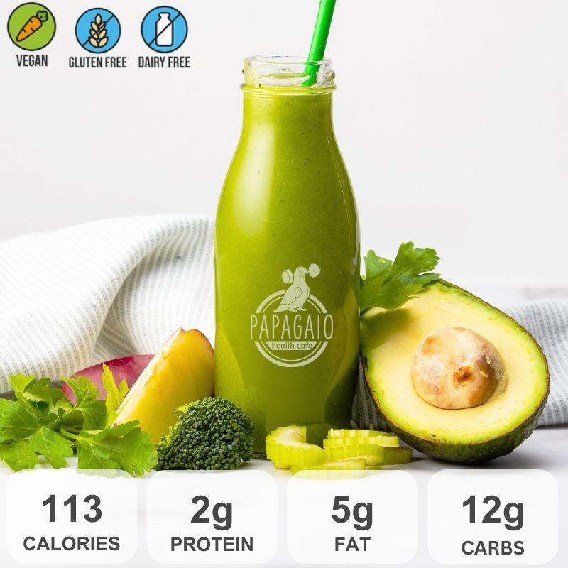 Ingredients: apples (36%), coconut water (30%), celery (12%), avocado (9%), lemon juice (8%), spinach (6%), broccoli (5%), coriander, parsley, ginger.